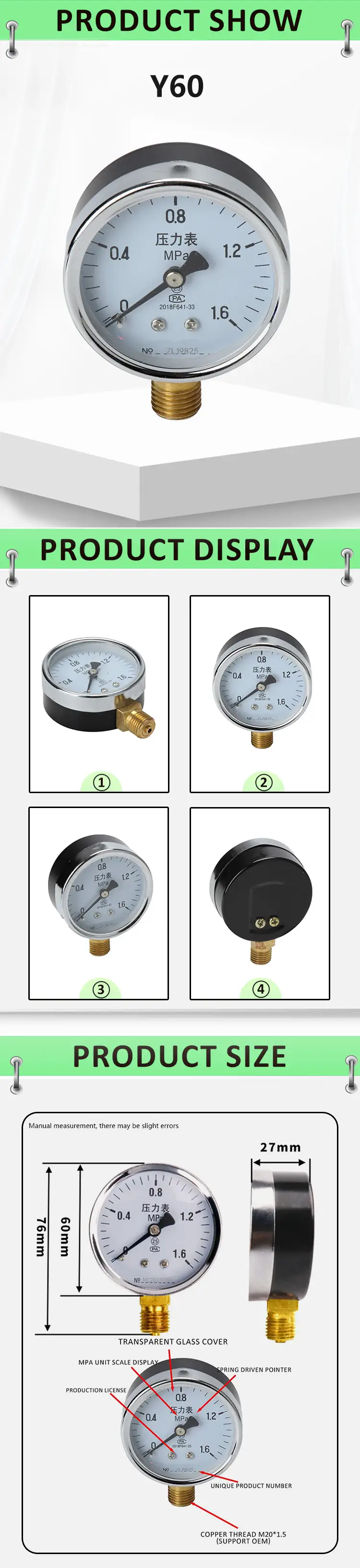 | MEASURE RANGE | 0~0.1MPa(1KG) 0~0.16MPa(1.6KG) 0~0.25MPa(2.5KG) 0~0.4MPa(4KG) 0~0.6MPa(6KG) 0~1MPa(10KG) 0~1.6MPa(16KG) 0~2.5MPa(25KG) 0~4MPa(40KG) 0~6MPa(60KG) 0~10MPa(100KG) 0~16MPa (160KG) 0~25MPa(250KG) 0~40MPa(400KG) 0~60MPa(600KG) |