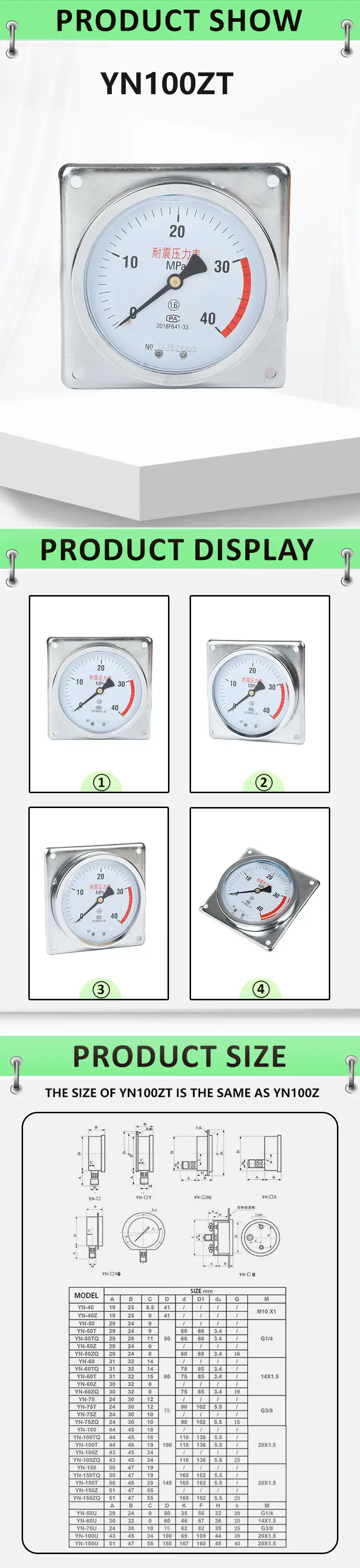| TYPE | YN-ZT Axial Shock-Proof Pressure Gauge With Behind Flange Edge |