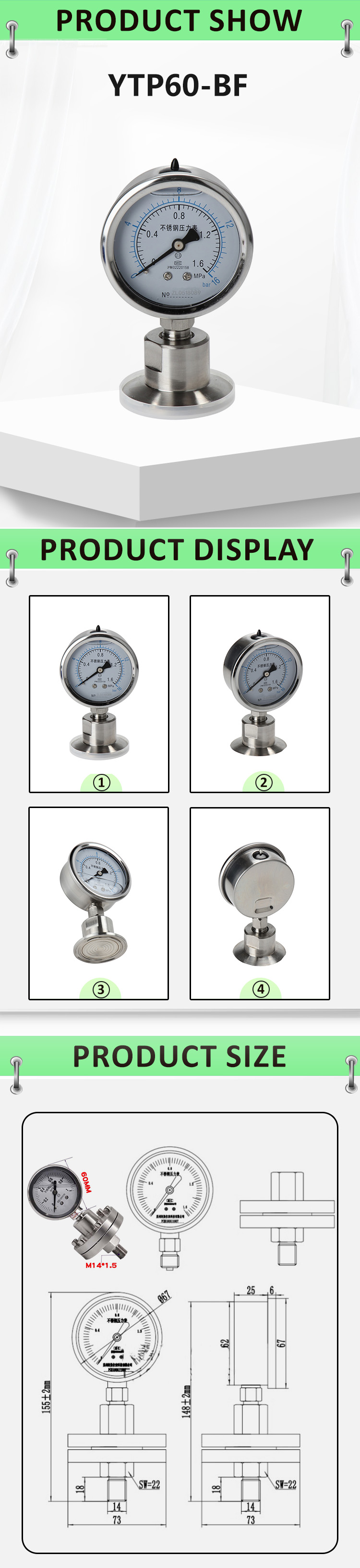 | TYPE | YTP-BF Stainless Steel Sanitary Diaphragm Pressure Measuring Instruments Meter |